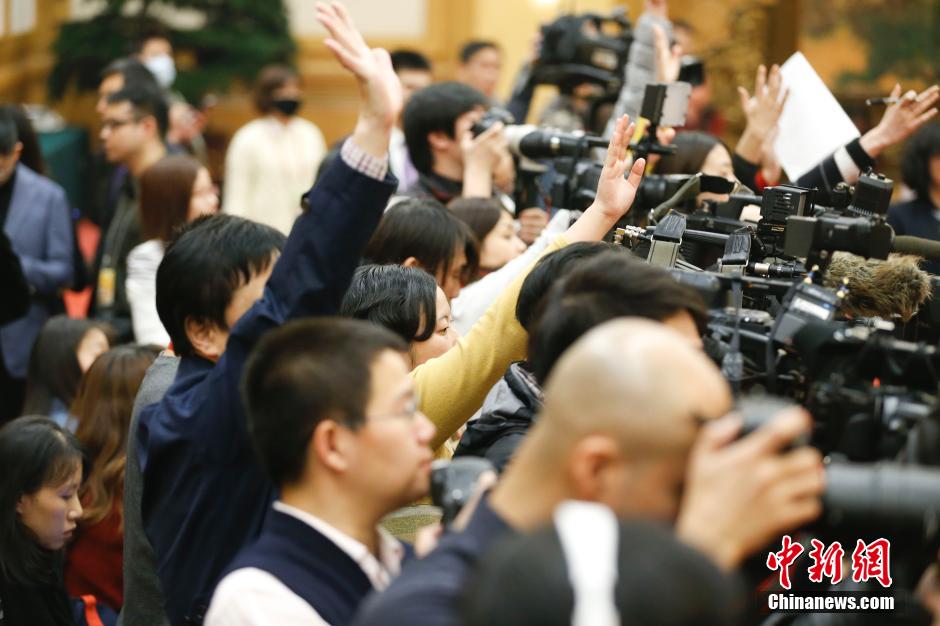 3月6日,参加十二届全国人大三次会议的上海代表团在人民大会堂举行全体会议,审议政府工作报告。媒体举手提问。中新社发 杜洋 摄