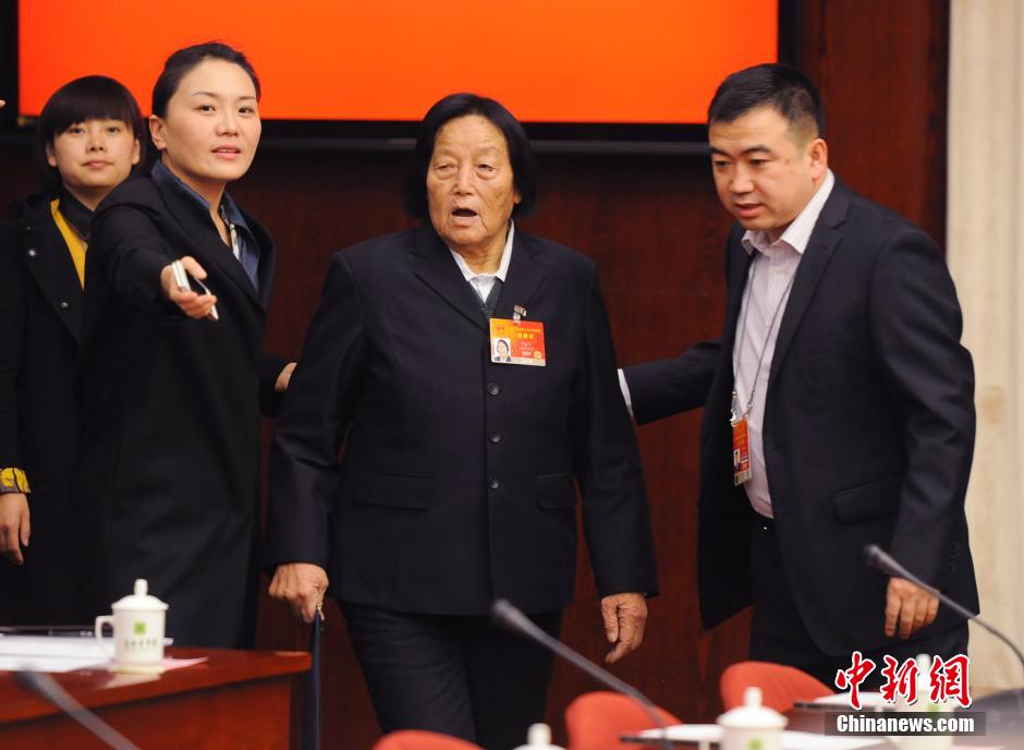 3月6日,参加十二届全国人大三次会议的山西省代表团在北京举行全体会议,审议政府工作报告。全国人大代表申纪兰参加会议。中新社发 侯宇 摄
