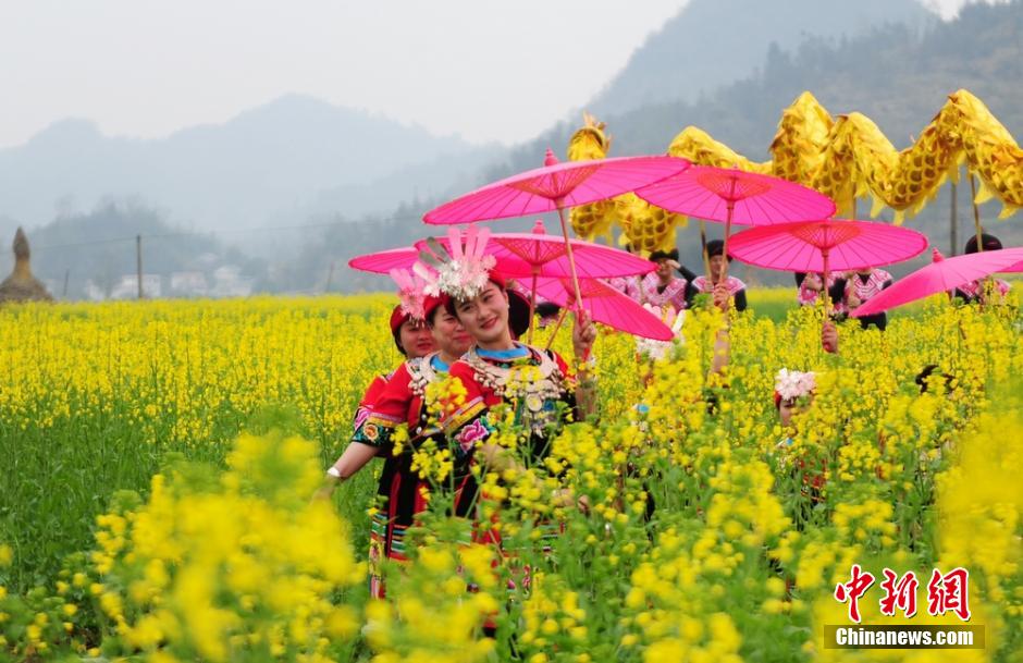 苗家姑娘在油菜花中跳起了“接龙舞”。 杨华峰 摄