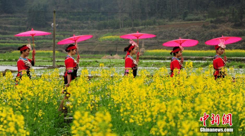 图为苗家姑娘走过油菜花地。 杨华峰 摄