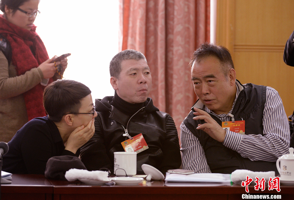 3月5日,全国政协举行小组会议,讨论政府工作报告。全国政协委员陈凯歌、冯小刚、宋丹丹(右起)参加文艺界别讨论。中新社发 侯宇 摄
