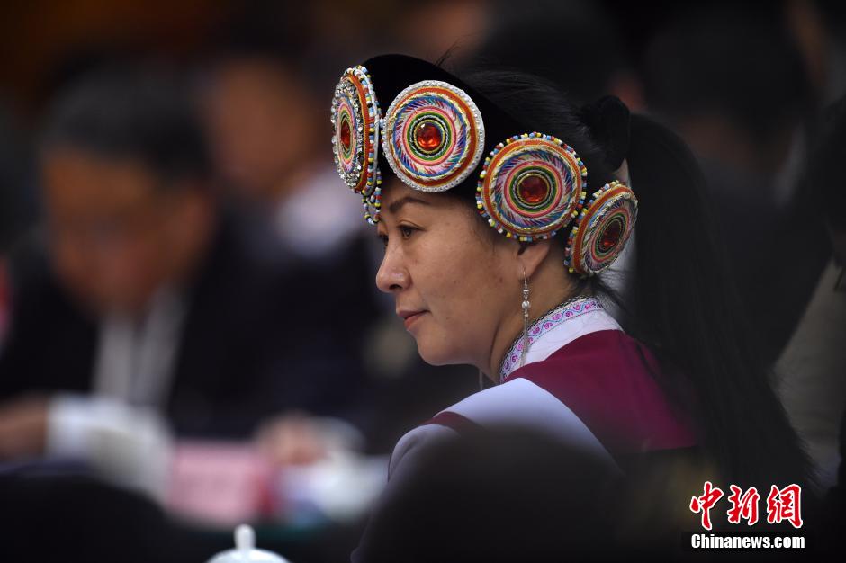 3月7日,参加十二届全国人大三次会议的云南代表团在中国职工之家全体会议审议政府工作报告,审查计划报告和预算报告。云南各少数民族代表身着传统民族服饰参加会议。中新社记者 金硕 摄