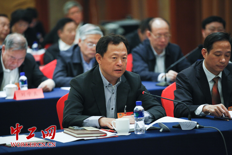3月7日上午,全国政协总工会界别举行联组讨论,全国总工会党组书记、副主席、书记处第一书记李玉赋专程来到会议现场,并与委员们一同参加讨论。图为全国政协委员王俊峰发言。中工网记者韩靖摄