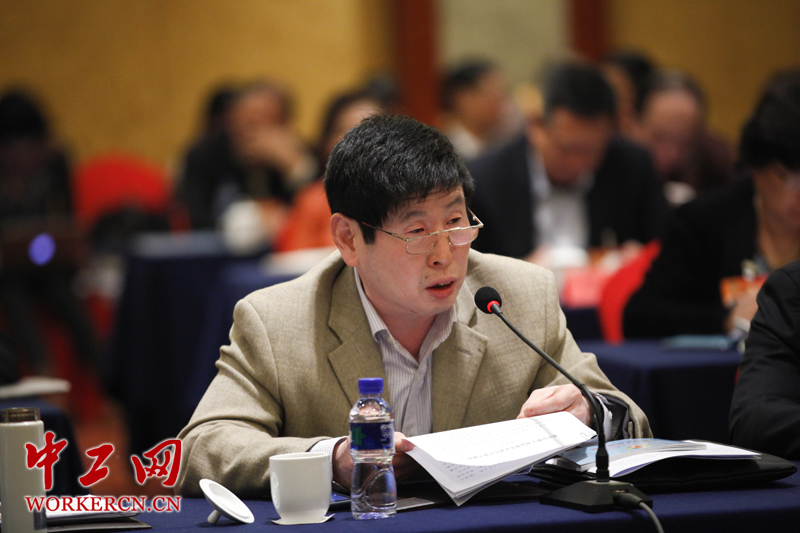3月7日上午,全国政协总工会界别举行联组讨论,全国总工会党组书记、副主席、书记处第一书记李玉赋专程来到会议现场,并与委员们一同参加讨论。图为全国政协委员李海滨发言。中工网记者韩靖摄