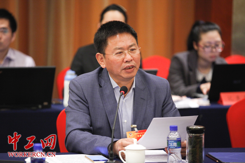 3月7日上午,全国政协总工会界别举行联组讨论,全国总工会党组书记、副主席、书记处第一书记李玉赋专程来到会议现场,并与委员们一同参加讨论。图为全国政协委员张华荣发言。中工网记者韩靖摄