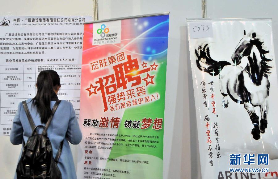 当日,浙江省春季人才交流大会在杭州和平会展中心举行,这是浙江2015年首场大型交流招聘会。本次大会共有700家单位参展,共推出岗位1.5万余个,参展企业涉及金融、设计、市场营销、经营管理、建筑、产品开发等近60个专业领域。新华社发(朱引炜 摄)