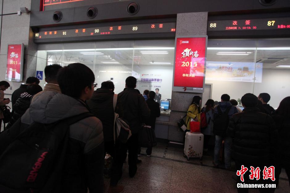 3月7日,沪杭高铁因故障问题出现大面积晚点,造成部分车次旅客受影响。 据了解,当天上午9时43分,沪杭高铁嘉兴南到桐乡段设备故障,目前故障已经排除,列车正在恢复中。图为部分受影响列车旅客排队退票。 中新社发 张亨伟 摄