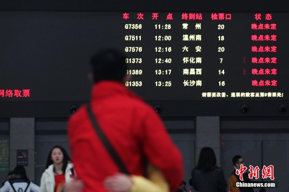 3月7日,沪杭高铁因故障问题出现大面积晚点,造成部分车次旅客受影响。 据了解,当天上午9时43分,沪杭高铁嘉兴南到桐乡段设备故障,目前故障已经排除,列车正在恢复中。图为车站大屏幕显示的信息为“晚点未定”。 张亨伟 摄