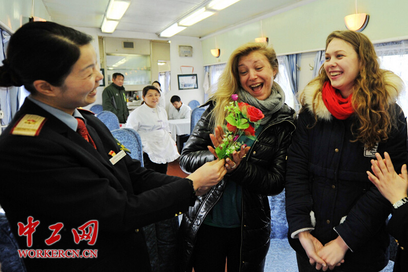 3月8日,赣州至南昌的L3612次列车上工作人员和来自乌克兰的旅客在列车上欢度自己的节日。当日是“三八”国际劳动妇女节也是周末假日,来中国读书的乌克兰女孩SOFIIA(白色衣服)、安娜(黑色衣服)和尼卡(蓝色衣服)在中国的列车上和大家一起度过了一个别样的妇女节,不仅享受到了中国女同胞的热情接待,还吃到了富有中国特色的小吃,芬芳的节日绽放出中乌两国女同胞别样美丽。