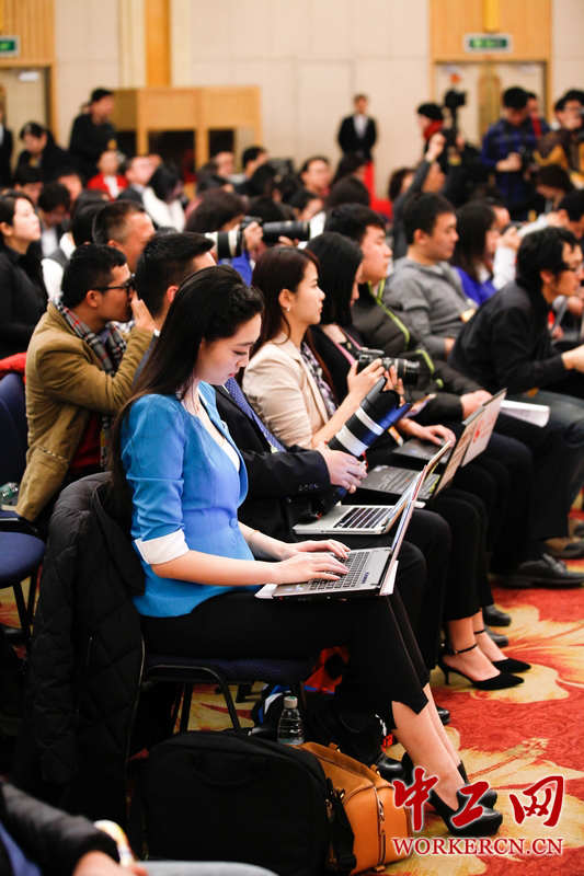3月9日上午,全国政协十二届三次会议召开主题为“政协委员谈发挥人民政协在社会主义协商民主中的重要作用”的记者会,会议邀请了全国政协委员陈惠丰、全国政协常委周汉民以及全国政协委员唐晓青、王俊峰、姚明回答记者提问,全国政协委员姚明在谈到明星委员的话题时说:“明星委员是客观存在的一个社会现象,包括我自己在内,我们作为委员就应该做出有质量的提案,向社会上发出声音。我希望大家更多地去关注我们担任委员之后所做的事情,关注担任委员之后所做的提案质量、方向以及发出的声音。”图为现场记者。中工网记者韩靖摄