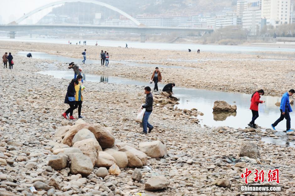 3月9日,兰州市民在裸露的黄河河床上休闲散步、捡拾黄河奇石。近日,黄河兰州段现大片裸露河床。中新社发 杨艳敏 摄