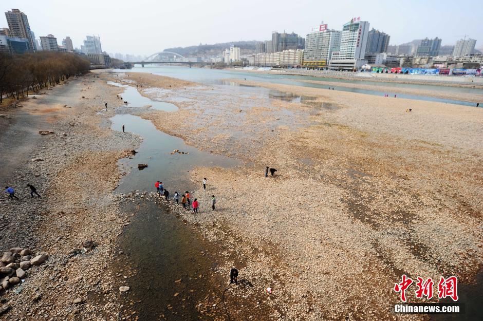 3月9日,兰州市民在裸露的黄河河床上休闲散步、捡拾黄河奇石。近日,黄河兰州段现大片裸露河床。中新社发 杨艳敏 摄
