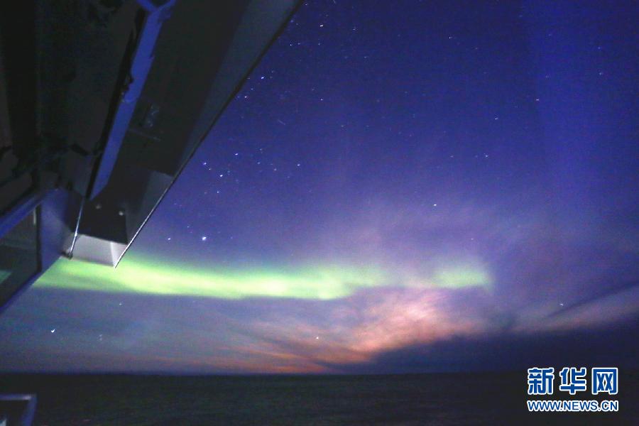 从“雪龙”号驾驶台看到的极光场面(3月7日摄)。 3月7日,正在南极普利兹湾航行的“雪龙”号巧遇极光。绚丽的极光与月光、星光及“雪龙”号灯光交相辉映,景色如梦似幻。 新华社记者 白阳摄