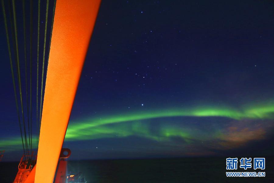 从“雪龙”号甲板上看到的极光(3月7日摄)。 3月7日,正在南极普利兹湾航行的“雪龙”号巧遇极光。绚丽的极光与月光、星光及“雪龙”号灯光交相辉映,景色如梦似幻。 新华社记者 白阳摄