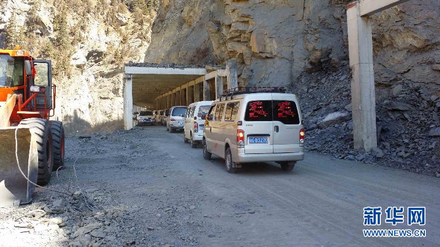 3月9日,小型车辆在恢复通行的川藏公路西藏昌都然乌段缓缓通行。经过武警交通二支队连续奋战,9日13时30分,因塌方受阻的川藏公路西藏昌都然乌段主干道已经恢复通车,小型车辆可以顺利通行。 8日9时30分,因气温回暖、岩石风化,造成川藏线昌都境内然乌段K3878+500处发生山体垮塌,40米路基被完全覆盖,塌方体最高处达10余米,塌方量4000余立方米,川藏公路主干道交通受阻。新华社发(陆文凯 摄)