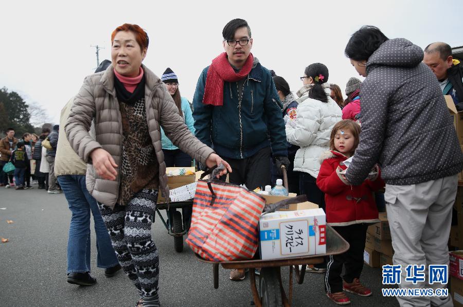 3月8日,在日本福岛县南相马市,来自中国香港的志愿者周展鹏(中)帮助灾民运送物资。当日,在日本福岛县南相马市的临时安置点,约60名来自不同国家和地区的志愿者为灾民提供安全饮用水和食物。受2011年“3·11”地震引发的福岛第一核电站事故影响,至今仍有十余万灾民居住在临时安置点,生活无法得到完全保障。新华社记者刘天摄