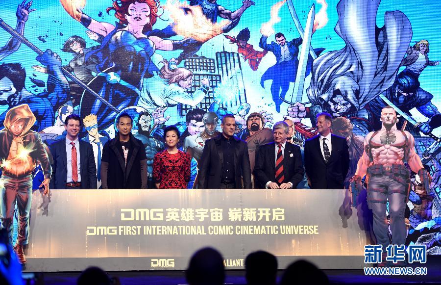 3月9日,嘉宾们在发布会上合影。当日,DMG印纪传媒在北京宣布与美国勇士娱乐在电影、电视、出版、授权等方面达成全新合作,勇士娱乐的漫画人物将陆续登陆院线。除电影以外,双方将共同开发中国授权领域,在中文出版、动画片、线上游戏、玩具、服装、现场活动、主题公园等方面分享市场。 DMG印纪传媒为深交所上市公司,曾与漫威联合出品《钢铁侠3》。美国勇士娱乐旗下有2000多个人物,勇士漫画至今已售出8200万本。新华社记者 金良快 摄