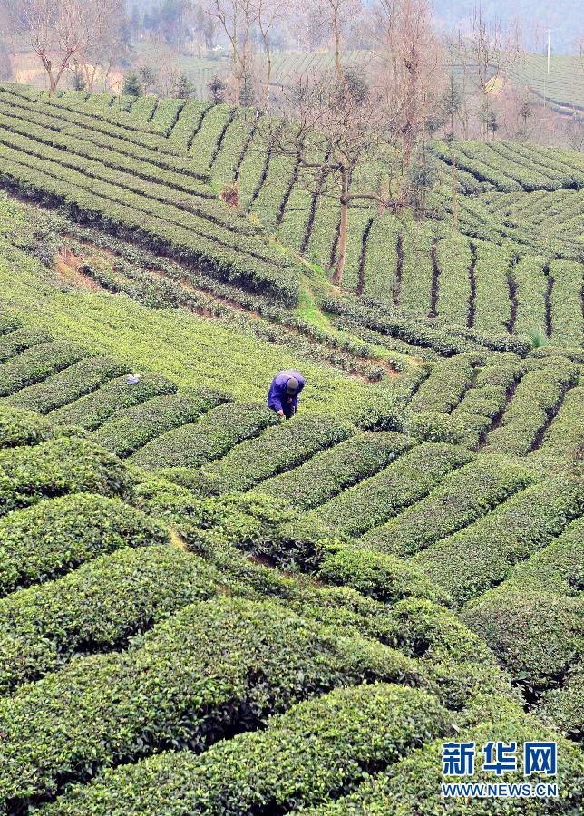 3月9日,一名茶农在湖北省恩施市芭蕉侗族乡灯笼坝村采摘早春茶。连日来,随着气温升高,湖北省恩施土家族苗族自治州恩施市23万亩富硒早春茶渐次进入采摘期,当地茶农抢抓农时采摘早春茶上市销售。新华社发(杨顺丕 摄)