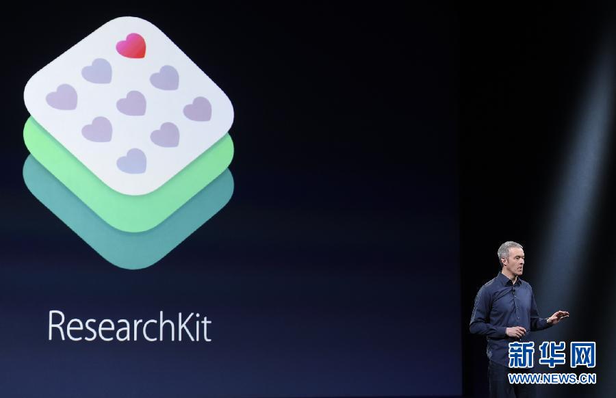 3月9日,在美国加州旧金山,苹果公司负责运营的高级副总裁杰夫·威廉姆斯在发布会上介绍ResearchKit。当日,苹果公司在美国加州旧金山举行2015年春季发布会。 新华社发