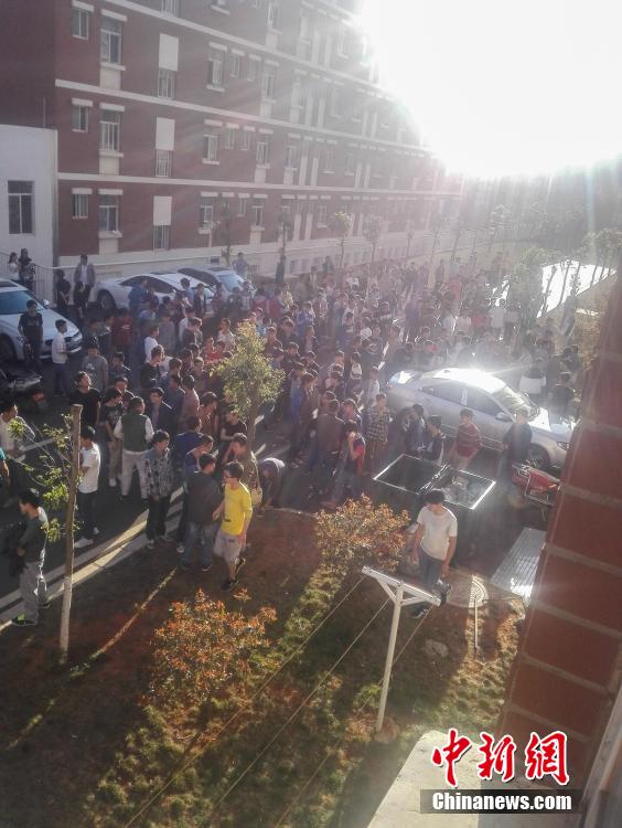 3月9日,云南省昆明市嵩明县发生4.5级地震,震中距离昆明市区约50公里,昆明主城区震感强烈。位于嵩明县境内的云南大学滇池学院杨林校区内,学生纷纷跑出宿舍避险。(手机照片)中新社发 者彦宇 摄