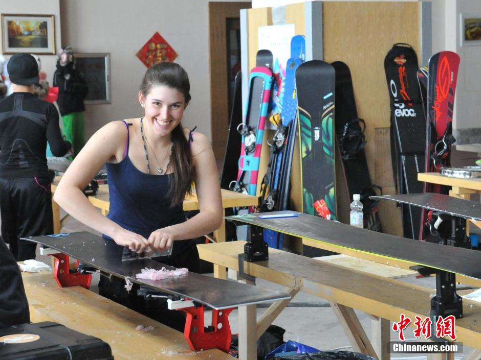 3月9日,2015国际雪联单板滑雪世界青年锦标赛在中国亚布力正式开赛。在首个比赛日进行的是坡式障碍资格赛。图为运动员在赛前为滑板打蜡。中新社发 魏来 摄