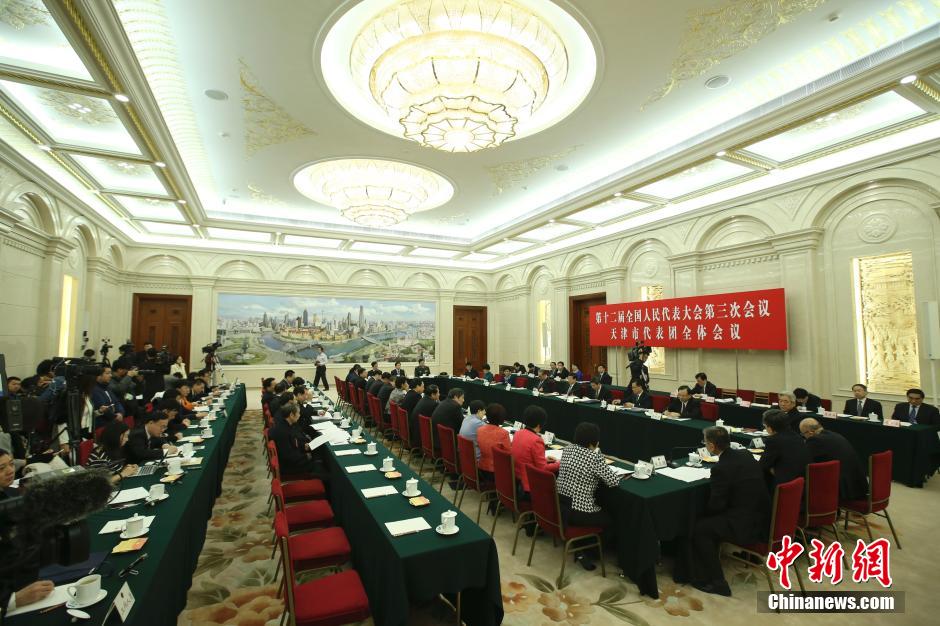 3月9日,参加十二届全国人大三次会议的天津代表团在人民大会堂举行全体会议,审议全国人大常委会工作报告。 中新社发 盛佳鹏 摄