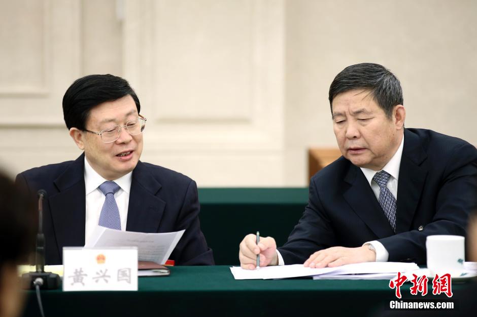 3月9日,参加十二届全国人大三次会议的天津代表团在人民大会堂举行全体会议,审议全国人大常委会工作报告。天津市委代理书记、市长黄兴国(左)和天津市人大常委会主任、党组书记肖怀远参加会议。 中新社发 盛佳鹏 摄