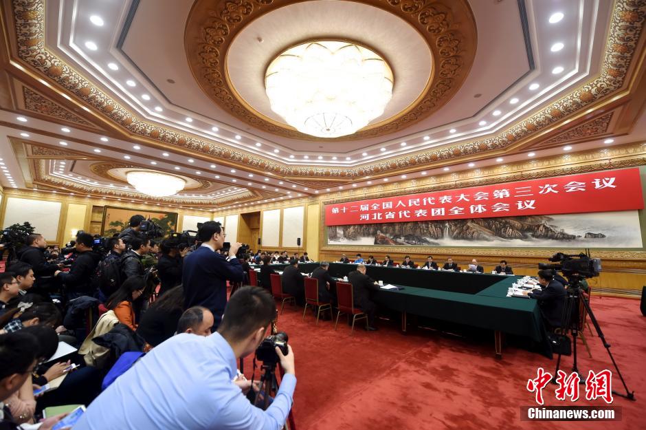 3月9日,十二届全国人大三次会议河北代表团在人民大会堂举行全体会议审议全国人大常委会工作报告。中新社发 陈文 摄