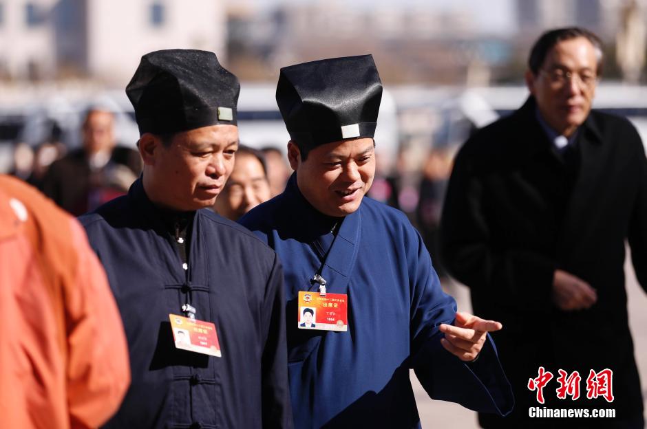 3月9日下午,全国政协十二届三次会议在北京人民大会堂举行第二次全体会议,16位委员围绕经济建设和生态文明建设主题作大会发言。全国政协委员、中国道教协会副会长丁常云(左二)走入大会堂。中新社发 杜洋 摄