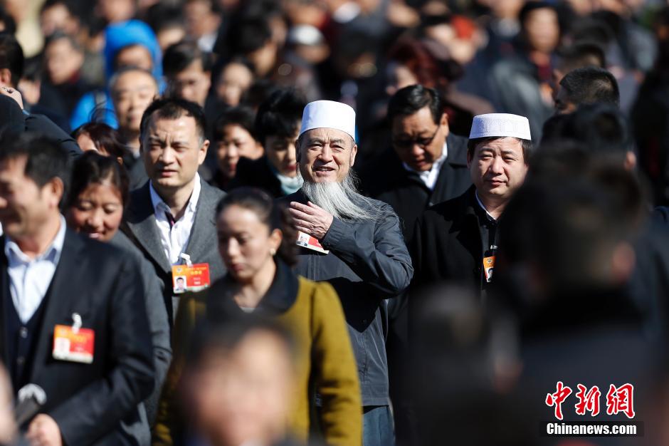 3月9日下午,全国政协十二届三次会议北京人民大会堂举行第二次全体会议,16位委员围绕经济建设和生态文明建设主题作大会发言。马开贤(中)委员步入会场。中新社发 盛佳鹏 摄