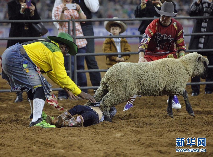 3月8日,在美国休斯敦牛仔节儿童骑绵羊比赛中,工作人员救起一名被甩到地上的小牛仔。当日,第79届休斯敦牛仔节在美国得克萨斯州休斯敦市NRG大球场继续进行。在牛仔节设立的竞技项目中,5-8岁儿童的骑绵羊比赛吸引了观众眼球。一年一度的世界最大的牛仔节于3月3日至22日在美国休斯敦举行。新华社发(宋穹摄)