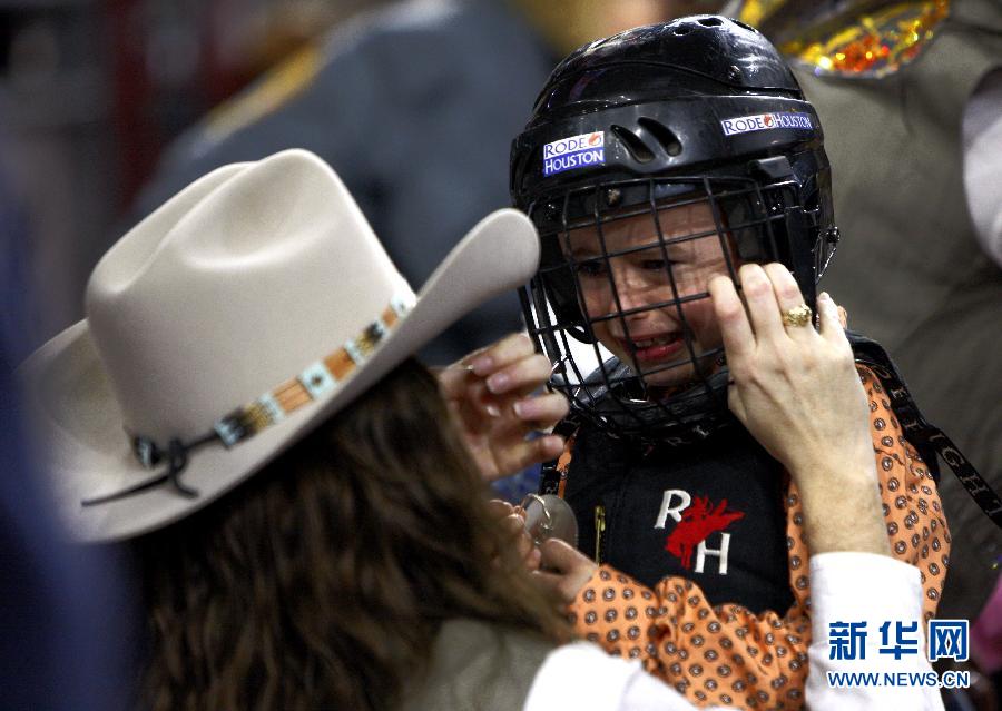 3月8日,在美国休斯敦牛仔节儿童骑绵羊比赛中,一名工作人员安慰一名哭泣的小牛仔。当日,第79届休斯敦牛仔节在美国得克萨斯州休斯敦市NRG大球场继续进行。在牛仔节设立的竞技项目中,5-8岁儿童的骑绵羊比赛吸引了观众眼球。一年一度的世界最大的牛仔节于3月3日至22日在美国休斯敦举行。新华社发(宋穹摄)