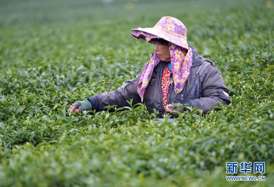 3月9日,茶农在柳州市柳城县伏虎农场采摘春茶。惊蛰过后,广西各地气温逐渐回暖,柳州市柳城县伏虎、柳城两个农场的早春茶进入采摘期,当地茶农抓紧采茶、制茶,以抢占市场,力争获得更好的经济效益。新华社发(邓克轶 摄)
