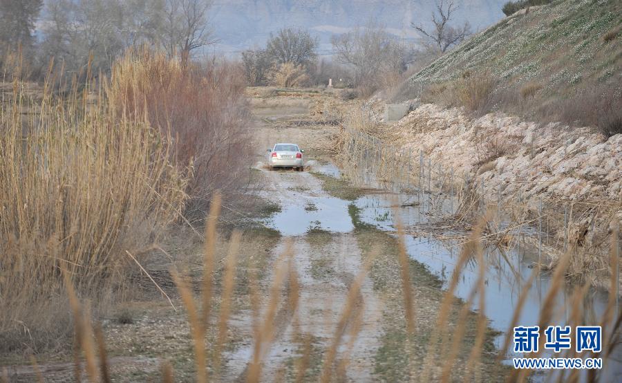 这是3月9日在西班牙萨拉戈萨省拍摄的洪水消退后的农田。受连续强降雨和融雪影响,西班牙埃布罗河流域自2月底以来遭洪水侵袭,数千民众被迫疏散。 新华社记者谢海宁摄