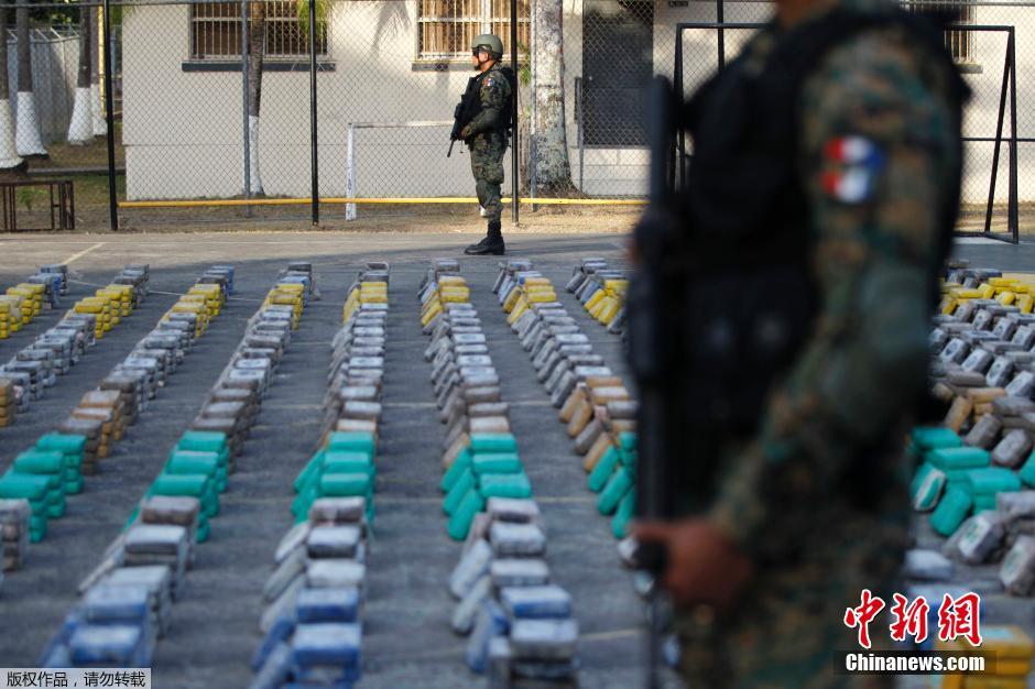 当地时间2015年3月9日,巴拿马城,巴拿马国家边境服务部展出缴获的1.9吨可卡因。