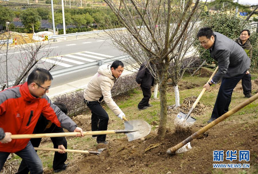3月10日,浙江省宁波市北仑区宣传系统的志愿者参加义务植树活动。在3月12日“植树节”来临之际,全国多地举行植树绿化活动,号召人们行动起来植树添绿,美化家园。 新华社发(索向鲁 摄)