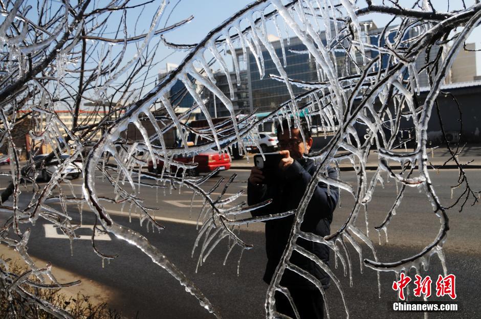 3月10日,山西太原,带由于气温偏低,街头绿化带内的树木和栏杆在喷灌后,结出了晶莹剔透的冰挂,成为一处别样景观。武俊杰 摄