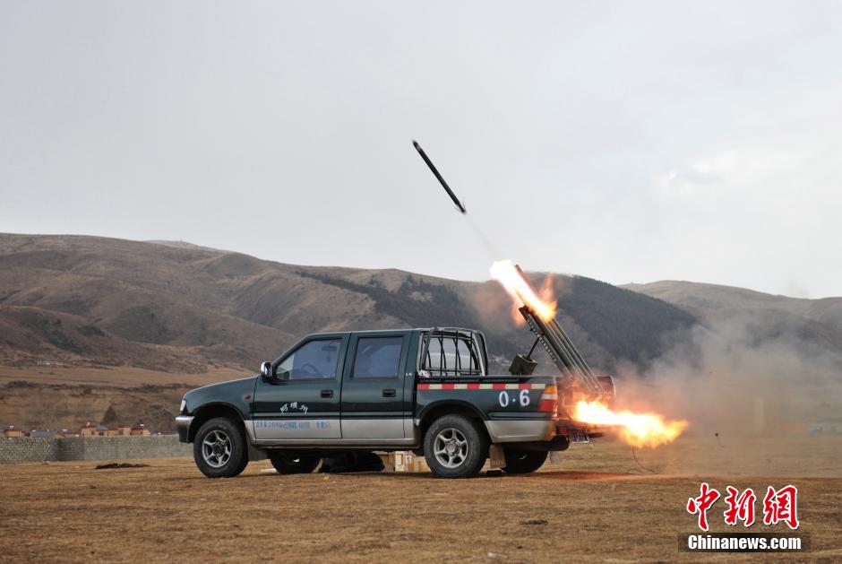 四川阿坝县近一个月来,无明显降水、降雪,森林草原火险等级居高不下,防火形势十分严峻。阿坝县气象局经过严密监测天气演变于3月10日捕捉到有利时机,发射人工增雪火箭弹,实施人工增雪作业。图为人工影响天气火箭弹发射出膛。中新社发 安源 摄