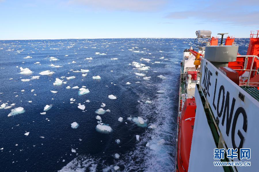 3月10日,“雪龙”号穿越南纬59.6度的浮冰区。当日,中国第31次南极科考队乘坐的“雪龙”号正式驶离南极圈,挺进西风带。“雪龙”号于2014年11月底抵达南极进行科考作业,并于今年3月5日启程返航回国。 新华社记者 白阳 摄