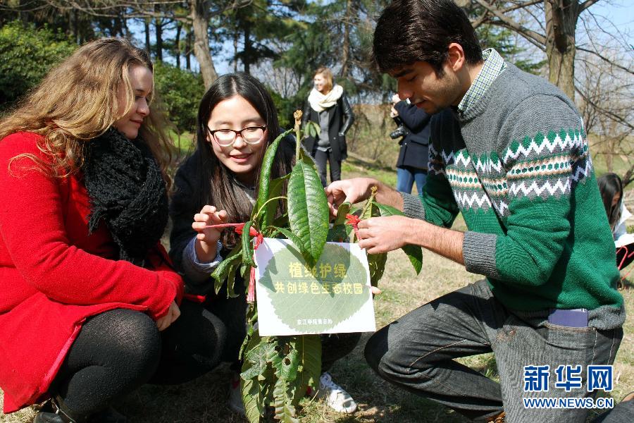 3月10日,江苏大学开展“中外学子共植友谊树”活动,中外大学生在刚植的小树上挂上护绿牌。在3月12日“植树节”来临之际,全国多地举行植树绿化活动,号召人们行动起来植树添绿,美化家园。 新华社发(石玉成 摄)
