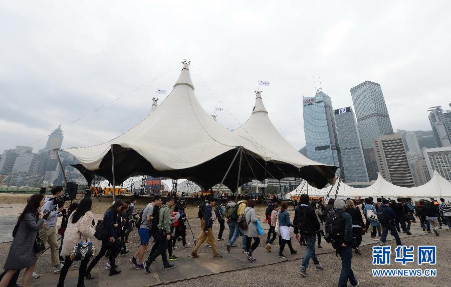 3月10日,媒体人士参观在香港中环搭建好的巨型白色马戏棚。
