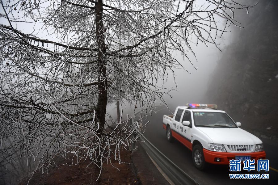 3月10日,一辆汽车在雾中的神农架道路上行驶。因独特的地理环境和近段低温天气,湖北省神农架高海拔地区出现雾凇景观,雾中的神农架美轮美奂,朦胧如画。 新华社记者 郝同前 摄