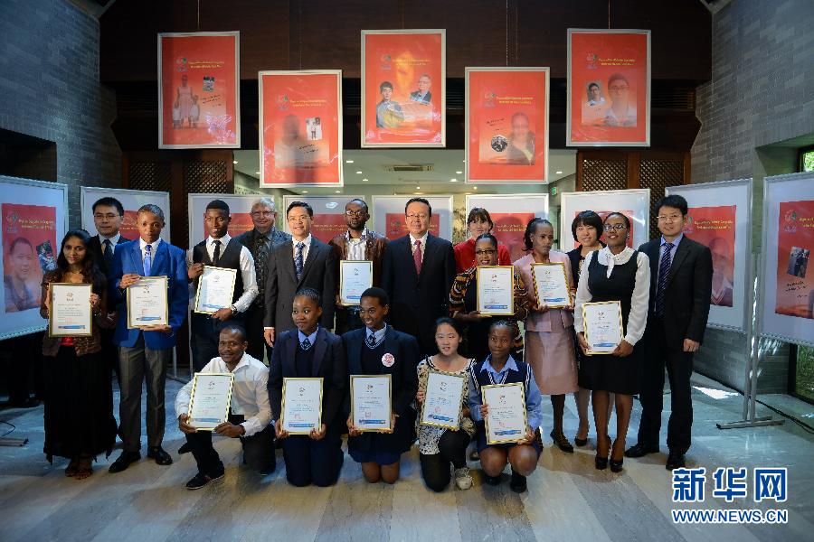 3月10日,在位于比勒陀利亚的中国驻南非大使馆,中国驻南非大使田学军(中)与获奖者合影。