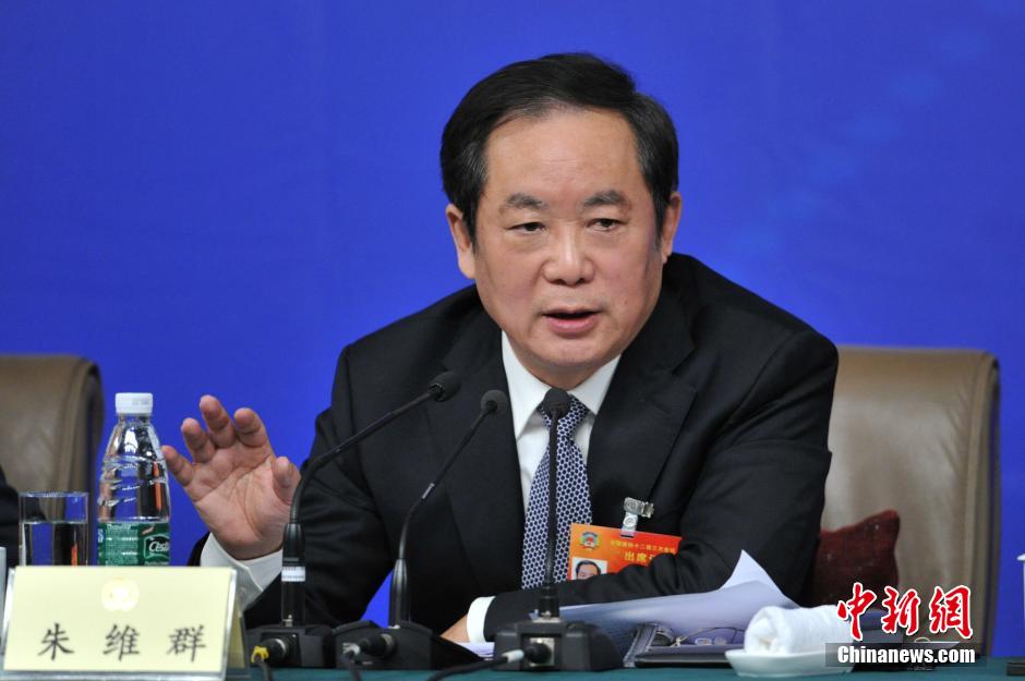 3月11日,全国政协十二届三次会议新闻中心在梅地亚中心多功能厅举行记者会,全国政协常委朱维群、黄洁夫以及政协委员胡晓义、李彦宏、俞敏洪围绕促进民生改善与社会和谐稳定回答中外记者提问。朱维群回答记者。 中新社发 张浪 摄
