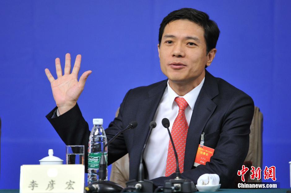 3月11日,全国政协十二届三次会议新闻中心在梅地亚中心多功能厅举行记者会。全国政协常委朱维群、黄洁夫以及政协委员胡晓义、李彦宏、俞敏洪围绕促进民生改善与社会和谐稳定回答中外记者提问。李彦宏回答记者。 中新社发 张浪 摄