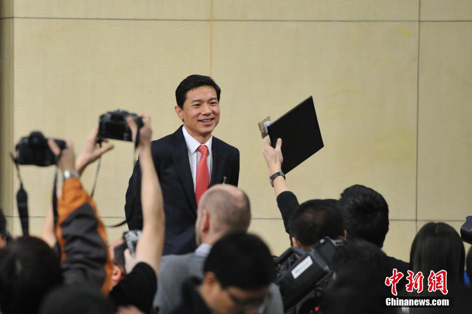 3月11日,全国政协十二届三次会议新闻中心在梅地亚中心多功能厅举行记者会。全国政协委员朱维群、黄洁夫、胡晓义、李彦宏、俞敏洪就促进民生改善与社会和谐稳定相关问题回答记者提问。李彦宏委员会后被记者包围。 中新社发 张浪 摄