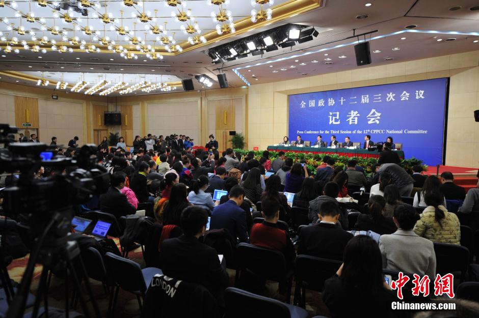 3月11日上午,全国政协十二届三次会议在梅地亚新闻中心举行记者会。全国政协常委朱维群、黄洁夫以及政协委员胡晓义、李彦宏、俞敏洪围绕促进民生改善与社会和谐稳定回答中外记者提问。 中新社发 张浪 摄