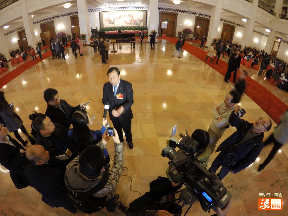 3月10日,北京人民大会堂,一名全国政协委员在接受记者采访。 新华社记者吕迅摄 图片来源:新华网
