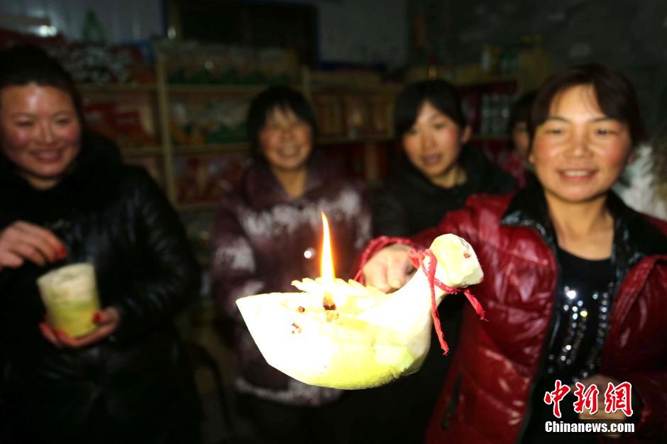3月9日晚间,河南省原阳县陈杏兰村,村民们挑着各式各样的萝卜灯庆祝一年一度的“添灯节”。 中新社发 杨正华 摄