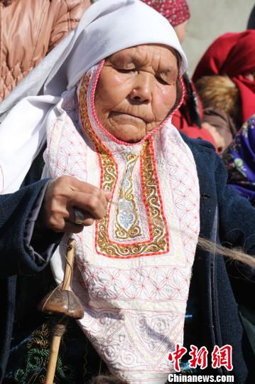 将羊毛均匀撕开,根据所需毛线的粗细,把羊毛搓成细条,一头挂在捻子哈萨克人叫“乌勒乔克”(纺毛线工具)上,多余搓好的毛线缠在小拇指上,把“乌勒乔克”左右转动,直到毛线捻成型。 樊琴 摄